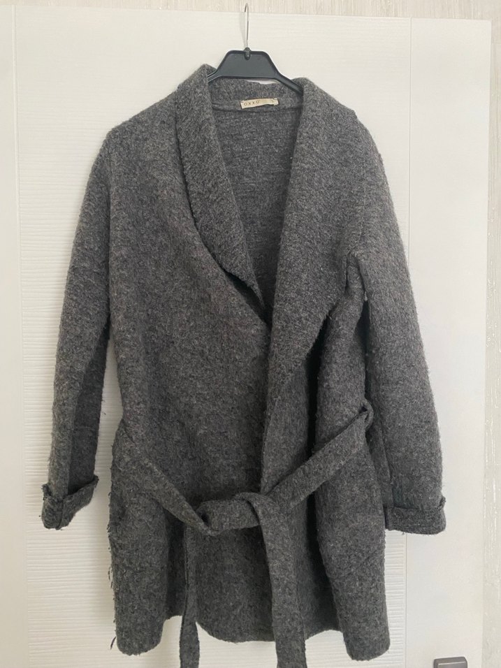 Oxxo Gri örgü yün kadın kaban, notched lapel yakalı ve bol kesimdir. Midi boyda, uzun kollu ve kuşaklıdır, rahat ve sıcak bir stil sunar.tiftiklenmesi mevcut temizlenirse yeni gibi kullanılabilir