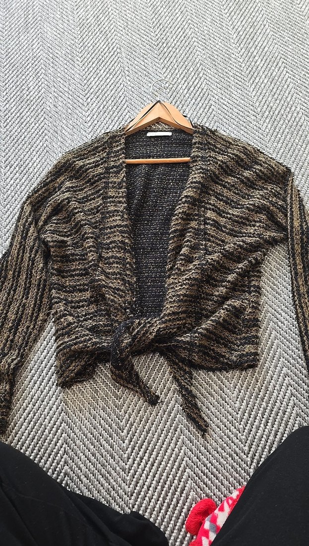 Örme kumaştan, bol kesim ve yakalı uzun kollu kahverengi ve gri tonlarında günlük kullanıma uygun midi uzunlukta hırka.