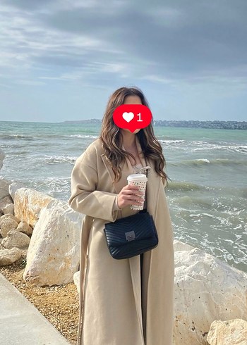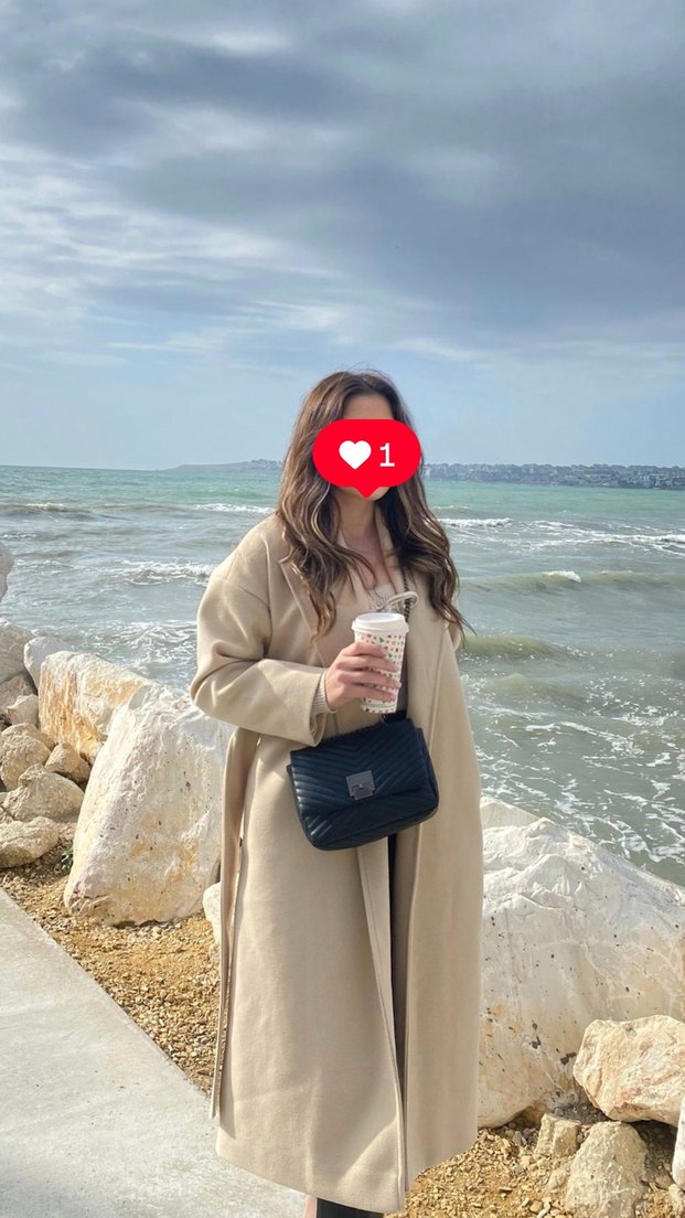 Yumuşak ve sıcak kumaştan, uzun, bej renkli, oversize kesim, çentikli yakalı ve kabarık kollu kaban. Günlük rahat kullanım için uygundur.