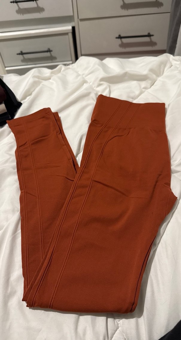 Koyu kahverengi, esnek sentetik kumaştan yapılmış, midi boy, dar kesim kadın tayt. Günlük sokak stili için uygundur. ♀️