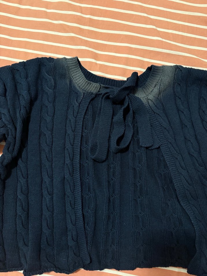Lacivert örgü kazak, yuvarlak yaka ve uzun kollu, rahat kalıp ve normcore tarzıyla günlük kullanıma uygundur. Sırtı açık ve bağlamalıdır.
