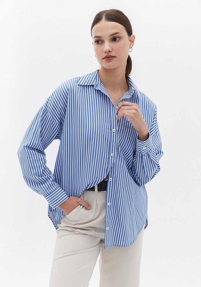 OXXO Mavi Oversize Cepli Çizgili Gömlek 38 beden mavi ve beyaz