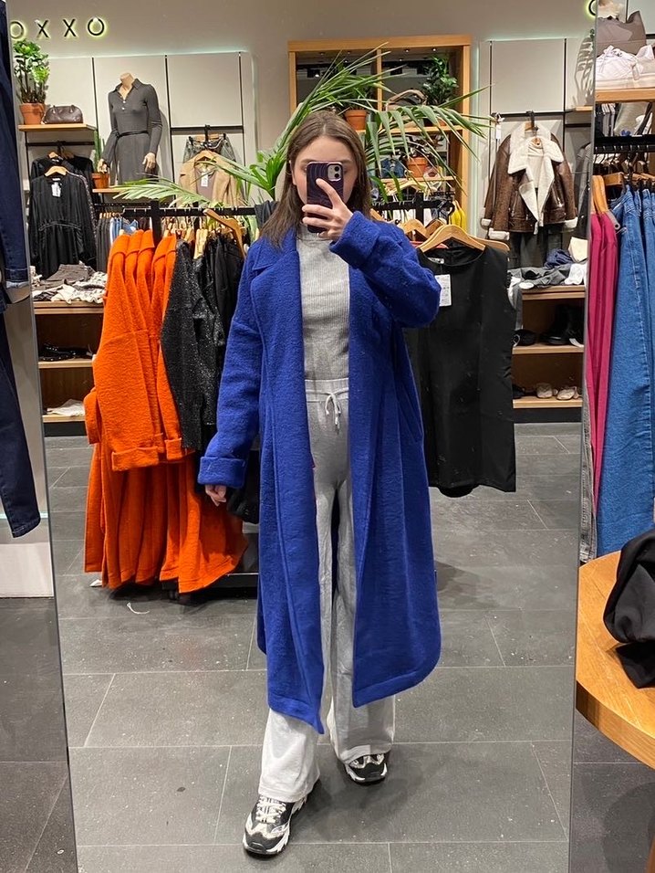 Mavi uzun kaban, bol kesim ve uzun kollu. Notch yaka detayıyla günlük sokak stiline uygun, rahat ve şık bir parça. Xs/36 beden yazıyor etikette ama s-m beden diye satışta