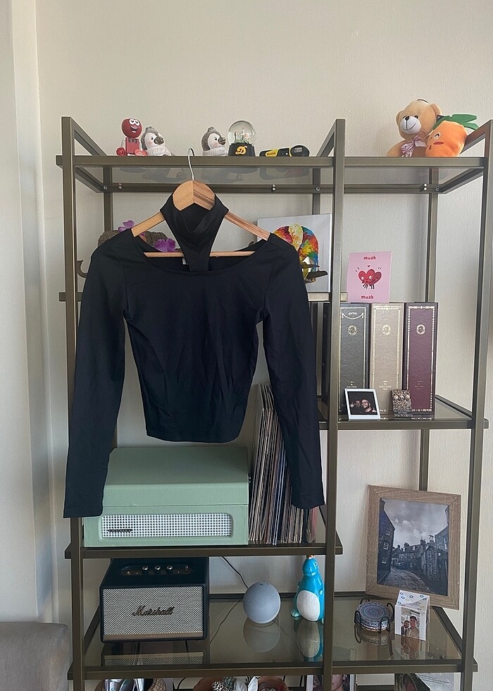 Oxxo marka M beden siyah strech kumaşlı, boğaz detaylı ve omuz dekolteli üst.