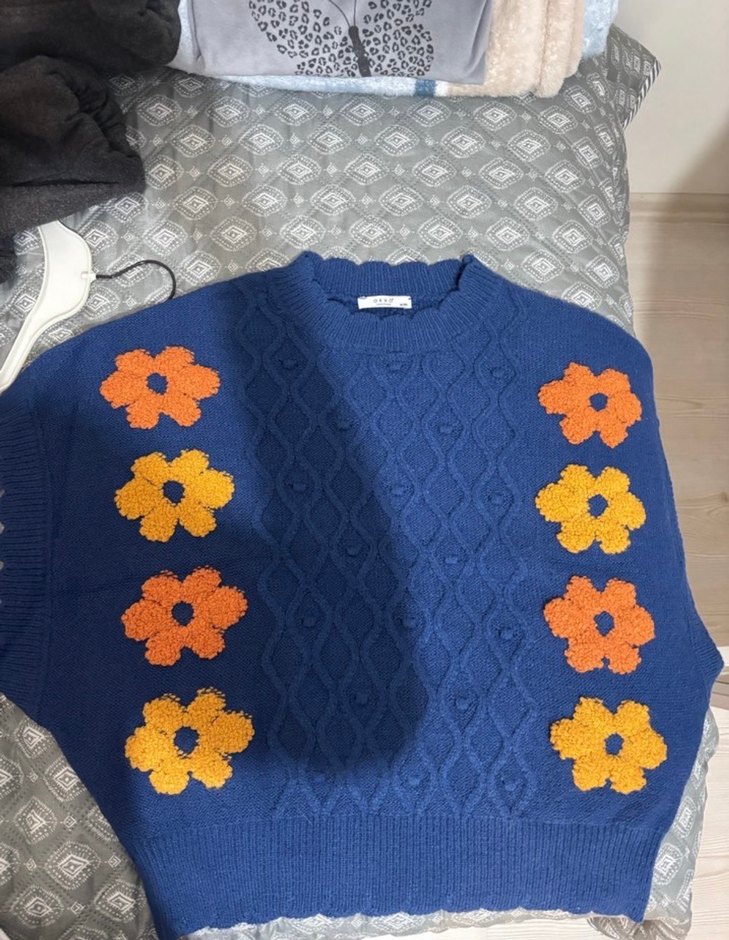Mavi triko kazak, nakışlı renkli çiçeklerle süslenmiş, yuvarlak yaka ve uzun kolludur. Salaş kesimi ve bohem tarzıyla rahat kullanıma uygundur.