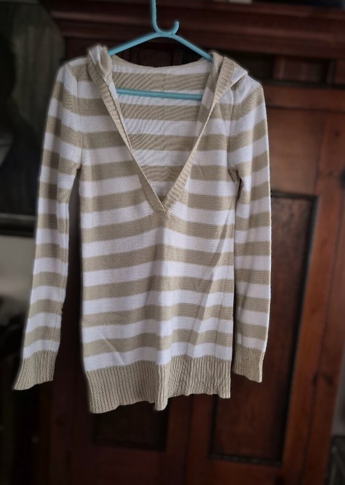 bej çizgili. merserize. kapüşonlu. dar kalıp uzun kazak. giyilemedi-yeni gibi. m beden : 46*74 cm
