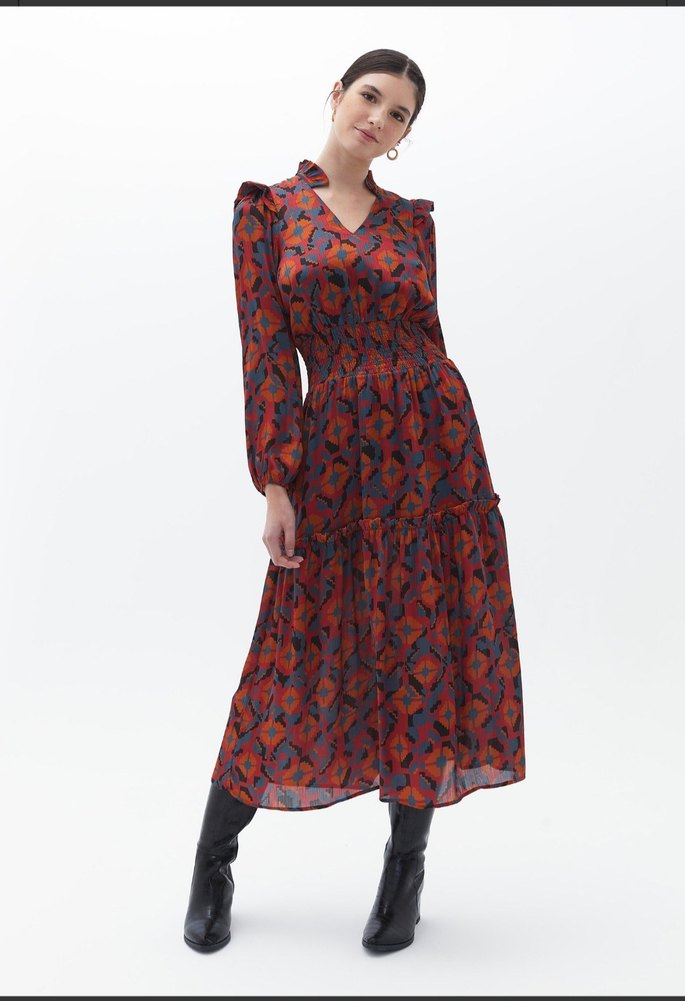 Uzun kol, V yaka ve kemerli bel detayına sahip bol kesim elbise. Yumuşak sentetik kumaştan, koyu çok renkli batik desenlidir.