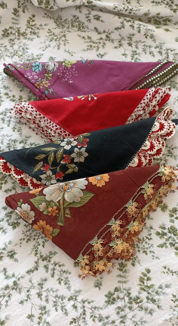 Koyu renkli, çok renkli çiçek desenli ve dantel detaylı vintage tarzı kadın fuları, yumuşak tekstil kumaştan üretilmiştir. oyali yazma tane fiyatıdır
