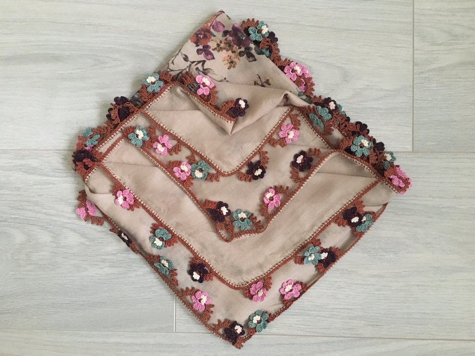 Bej renkte, dantel işlemeli ve pastel renkli çiçek nakışlı, bohem ve retro tarzda kadın fular.