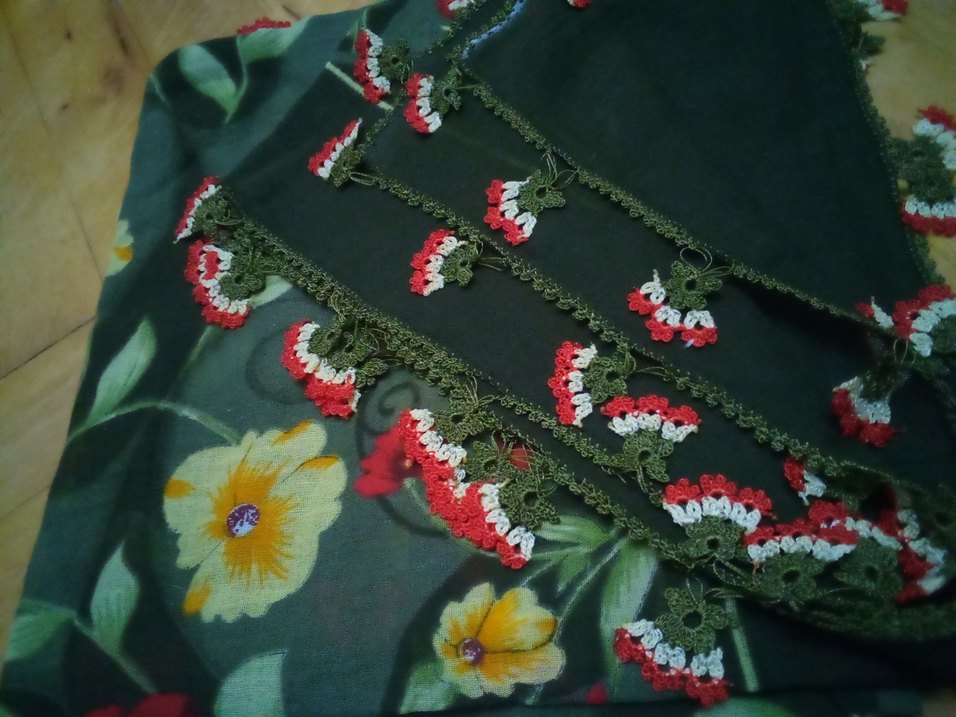 Kadın şalı, yumuşak örgü kumaş üzerinde renkli çiçek desenleri ve dantel detaylarıyla bohem ve retro tarzını yansıtıyor.