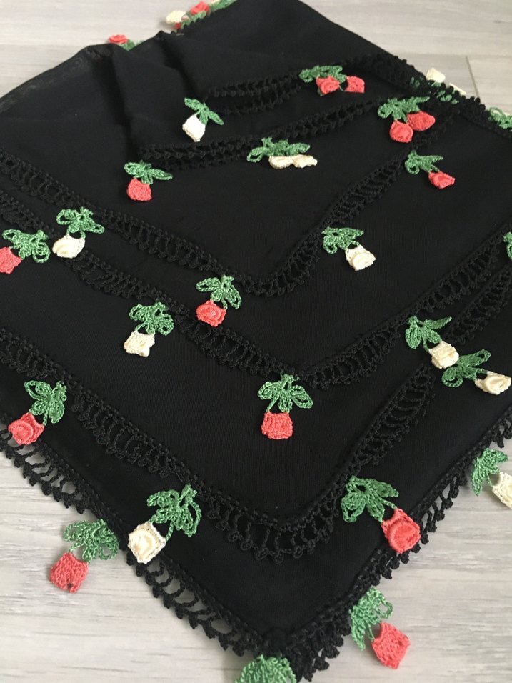 Karanlık çok renkli tekstil üzerine dantel detaylı ve küçük tığ işi çiçek süslemeleri bulunan, rahat ve bohem tarzda kadın şalı. Polo craft marka 100*100 ölçülerinde iğne oyası modeli tığ oyasıyla yapılmıştır.