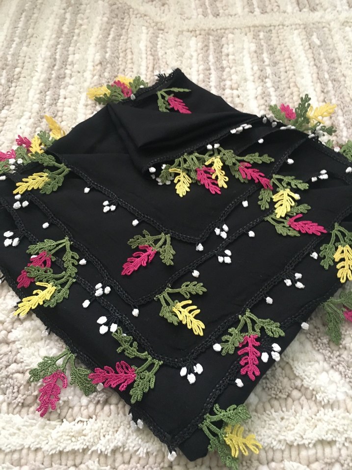 Kadınlar için çok renkli, koyu tonlarda tekstil şal. Dantel ve çiçek işlemeleriyle bohem, rahat bir stil sunar. Polo craft marka olup 100*100 ölçülerinde bir yazmadır. 3D örneklerden çıkarılmıştır