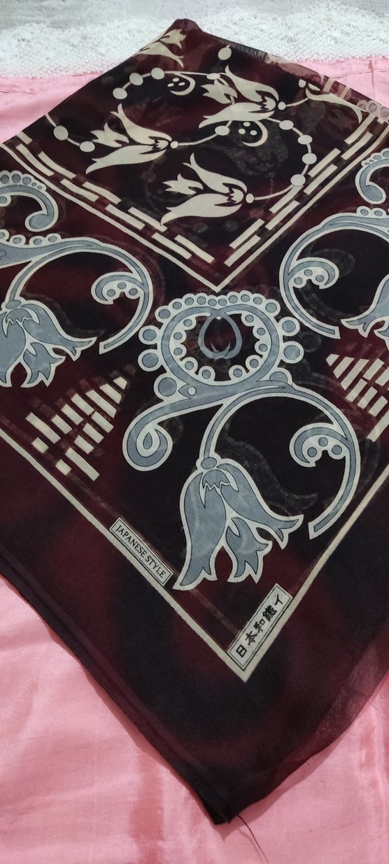 Bordo renkte, zincir detaylı vintage desenli, yumuşak sentetik kumaştan kadın fular. Bohem tarzına uygun şık bir aksesuar.