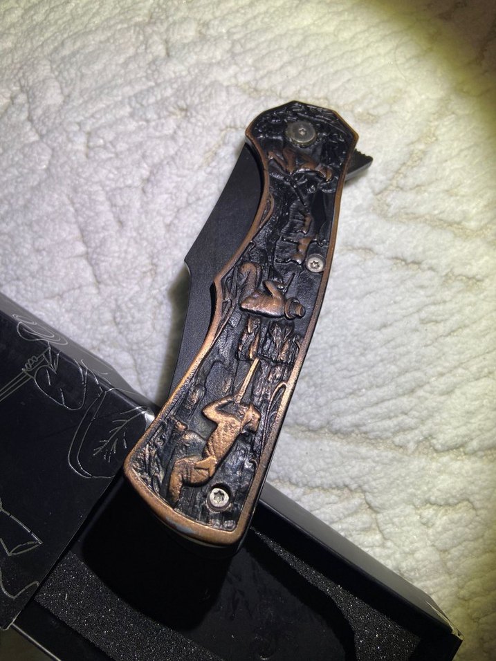 Oyma desenli koyu kahverengi kulplu katlanabilir bıçak, sağlam tutuş ve eşsiz görünüm sunar. ️