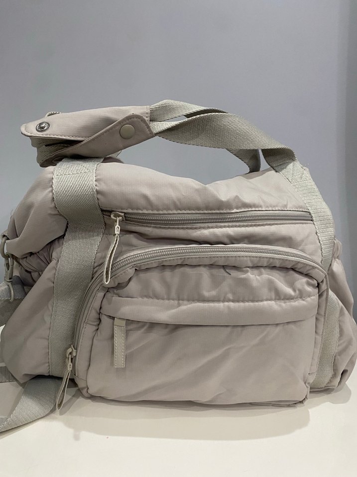 Gri renkli, kemer detaylı ve çok cepli kadın spor çantası. Yumuşak sentetik kumaştan yapılmış, günlük sokak stili için uygun sade ve temel tasarım.