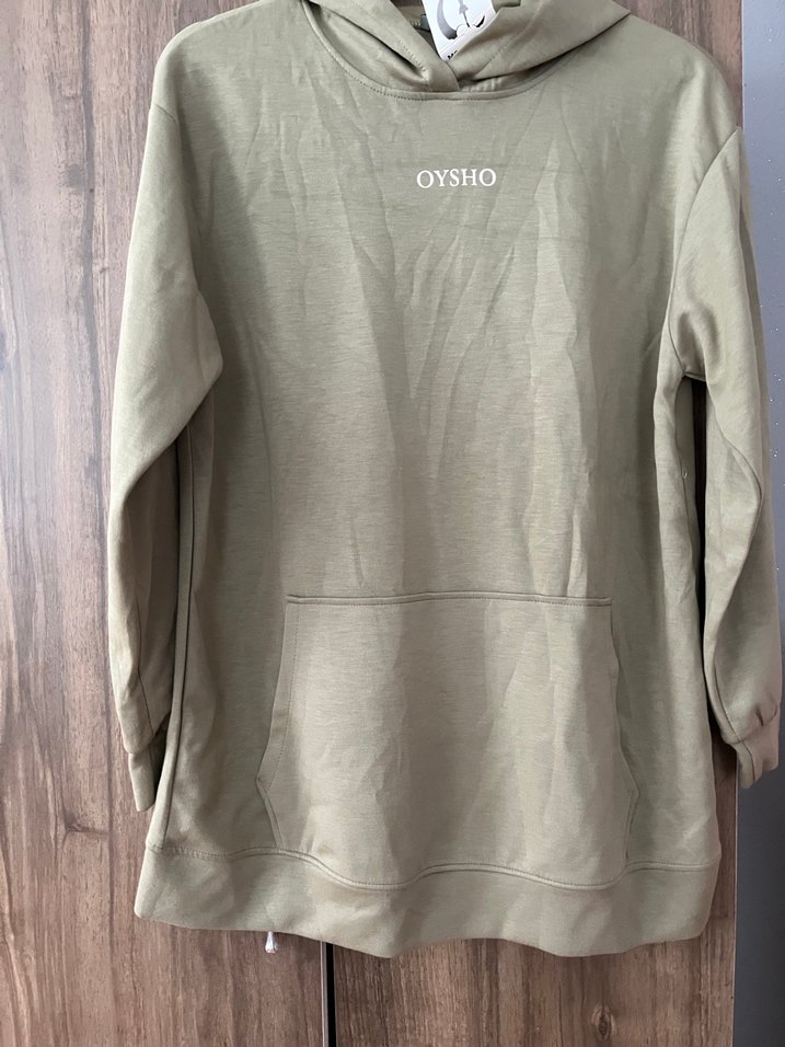 Oysho markalı, uzun kollu, bisiklet yaka ve bol kesim bej renkli keten kumaştan yapılmış sweatshirt, günlük kullanım için rahat ve şık bir görünüme sahiptir.