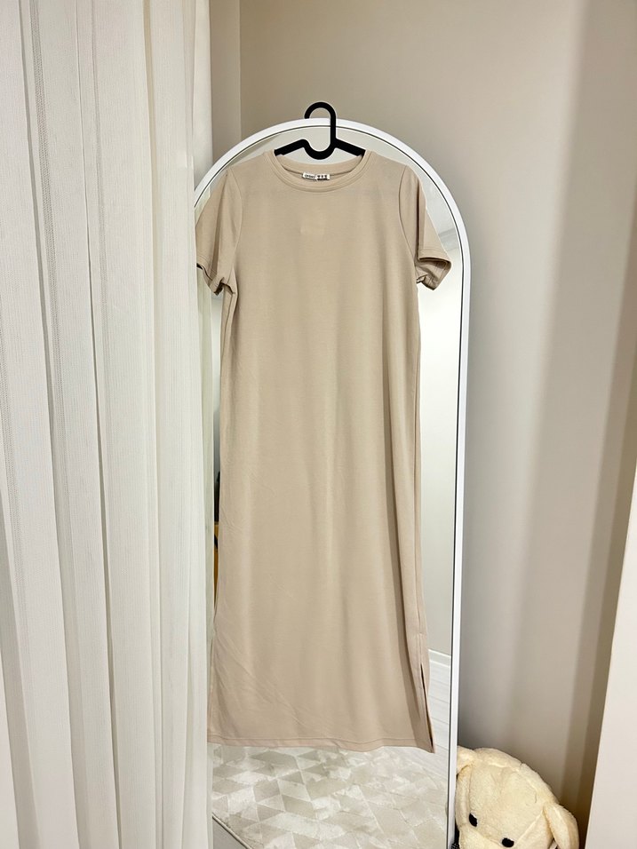 Bej renkli, kısa kollu ve bisiklet yaka uzun elbise. Rahat kesimi ve minimalist tarzıyla günlük kullanıma uygun, yumuşak sentetik kumaştan üretilmiştir.