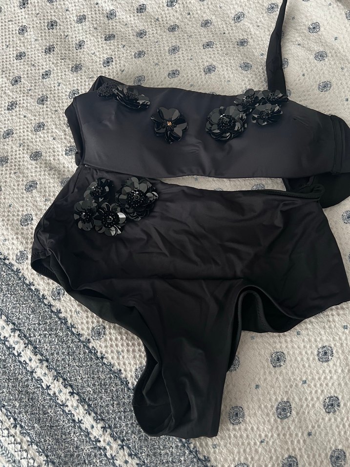 Boncuk işlemeli çiçek detaylarına sahip, yüksek bel bikini takımı. Etiketleri çok uzun olduğu için kesmiştim