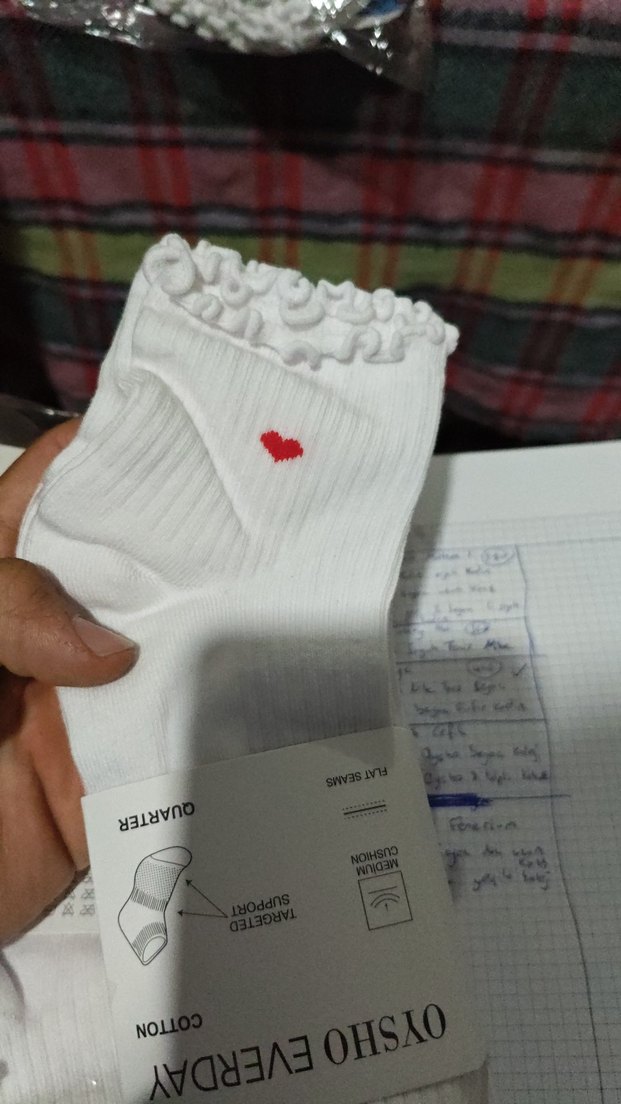 Yumuşak pamuklu beyaz kız çocuk çorabı, küçük kırmızı kalp baskılı ve fırfırlı kenarlıdır.