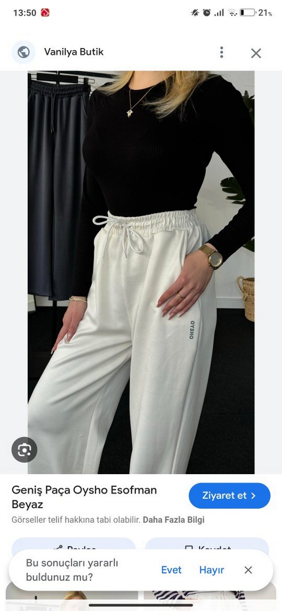 Oysho markasına ait beyaz pamuklu eşofman, geniş paça ve bol kesim ile günlük rahat şıklık sunar. Sokak stiline uygundur.