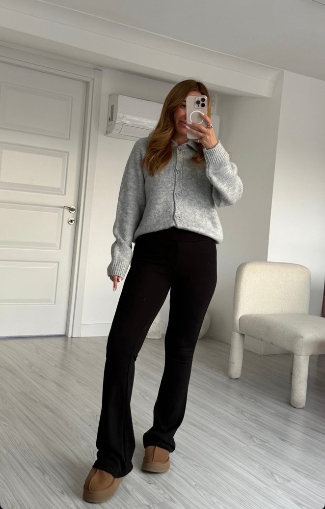 kadın pantolon, salaş kesim ve midi boyda, yumuşak ve sıcak kumaştan günlük rahatlık ve zahmetsiz şıklık sunar.
