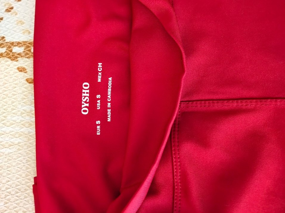 Parlak kırmızı renkte, fermuarlı detaylı, sentetik kumaştan yapılmış, vücuda oturan tayt. Spor ve sokak stili için uygun, baskılı desenli. Marka: OYSHO. ♀️