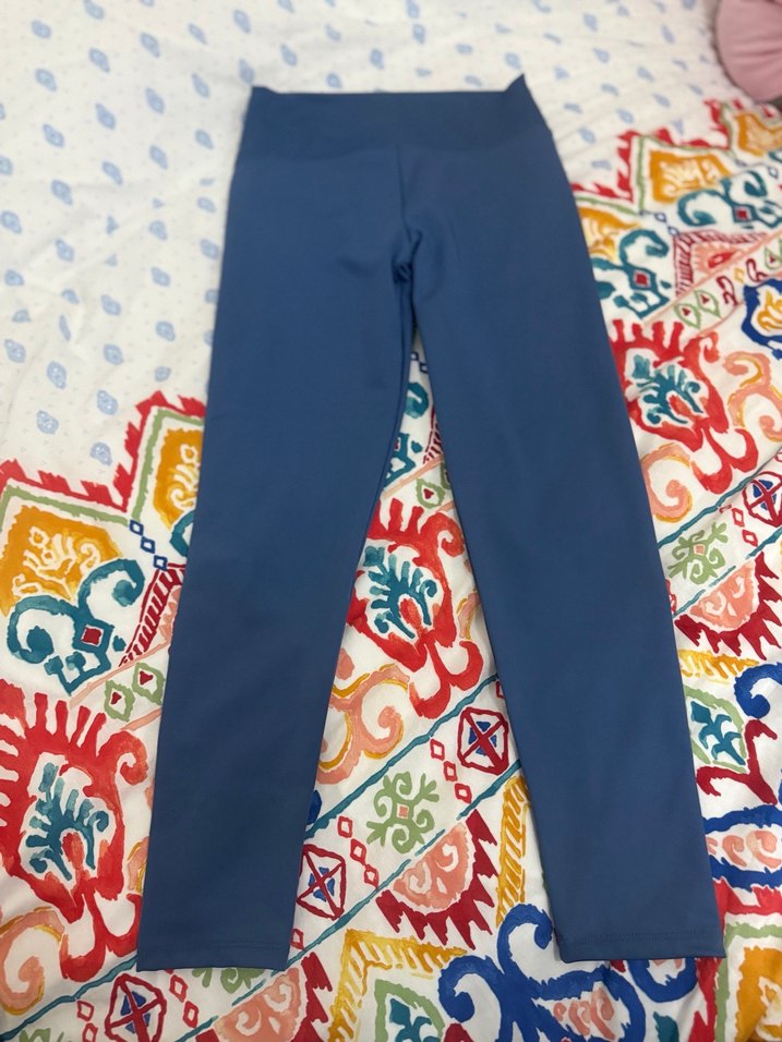 Kadınlar için uzun boylu, sentetik kumaştan yapılmış ve velcro detaylı, mavi renkli fit kesim tayt. Spor ve sokak giyimi için uygundur. bir iki defa giyildi