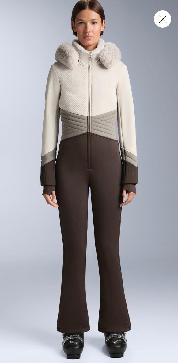 Bej ve gri tonlarında, uzun kollu, yüksek yakalı , vücuda oturan kadın kayak tulumu. Etiketlidir hiç giyilmedi.