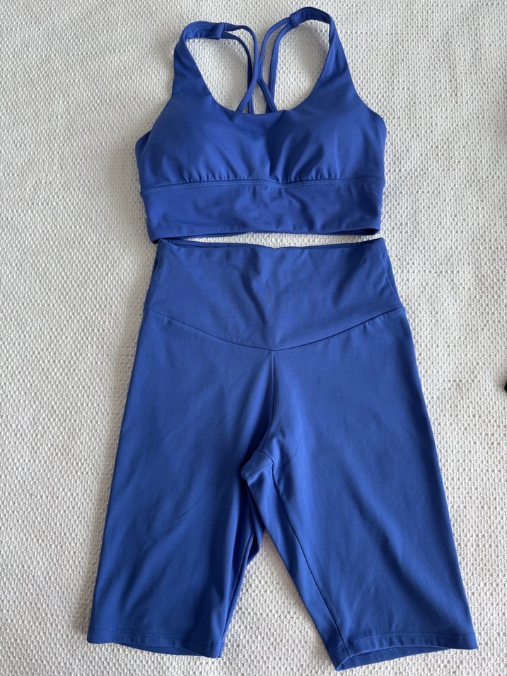 Koyu mavi renkli, sentetik kumaştan yapılmış, ince askılı V yakalı crop top ve yüksek bel mini tayt seti. Spor için uygun, rahat ve şık bir tasarım sunar.