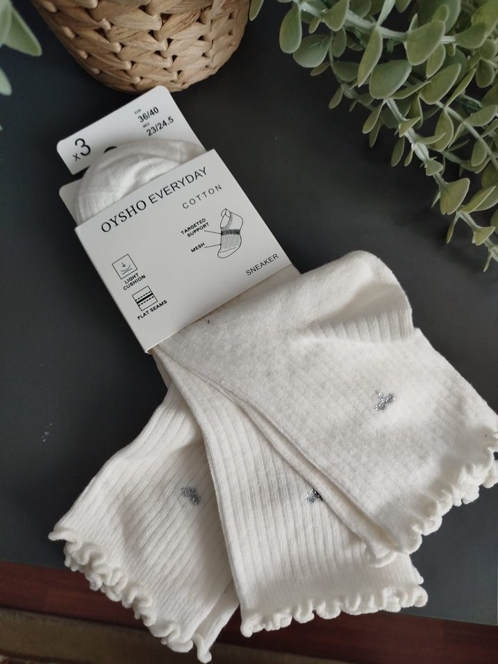 Beyaz pamuklu kız çorapları, üzerinde ince gri nakış detayları bulunur ve yumuşak dokuludur. Oysho Everyday koleksiyonundandır. #oysho #kadincorap #yeniyil #sevgililergunu #hediye