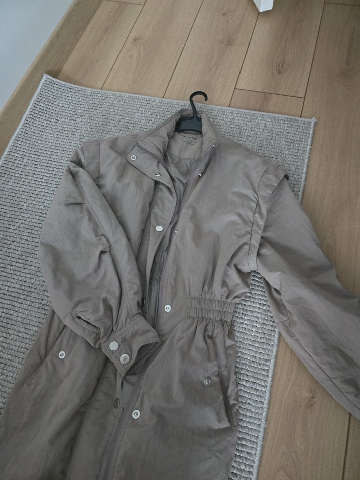 Düğmeli ön kapamalı, keten kumaştan gri, uzun kollu ve notalı yaka detaylı, midi boyda, fitted kesim kadın ceket. Minimalist sokak stili için uygundur.