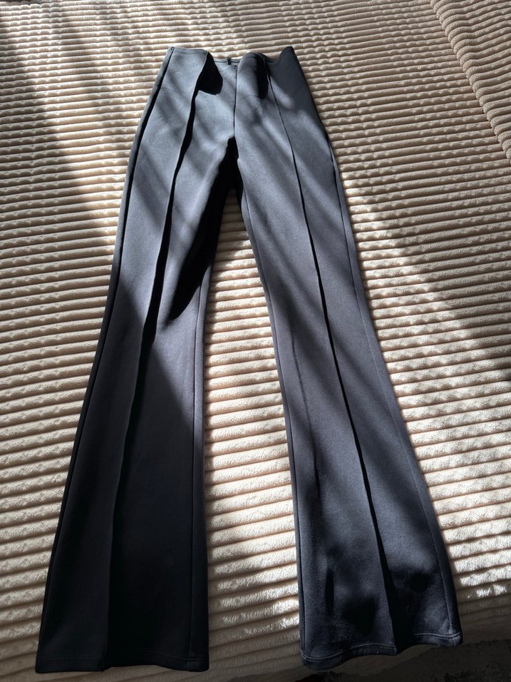Kadınlar için siyah, pileli ve uzun boylu, sentetik kumaştan yapılmış ispanyol paça pantolon. Günlük kullanıma uygundur.