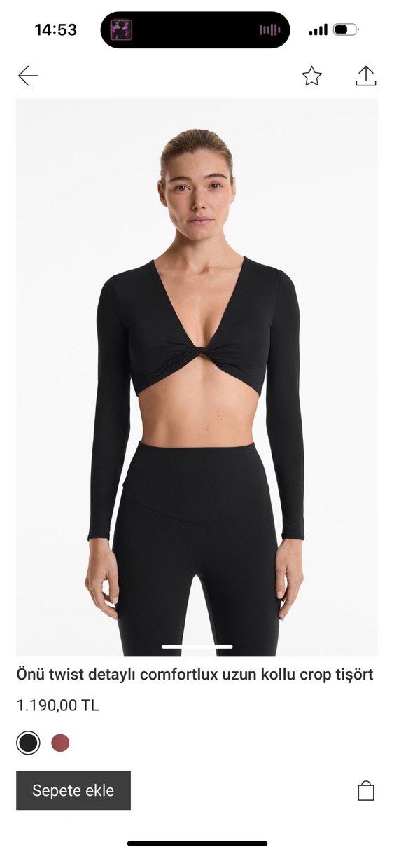 Önü twist detaylı, V yakalı, uzun kollu siyah crop top. Yumuşak sentetik kumaştan, şık ve rahat bir spor görünümü sağlar.