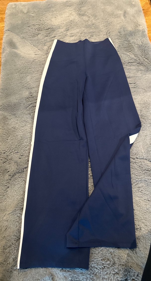Drapeli ve beyaz yan çizgili, regular fit uzun mavi kumaş pantolon. Düz, normcore tarzında, günlük kullanıma uygun. S beden fakat esnek kumaş toparlayıcılı bel
