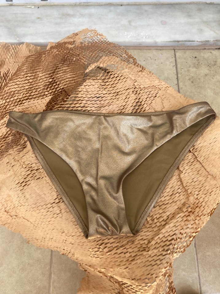 Kullanılmamıştır. Parlak görünümlü, gold renkli ve vücuda oturan bu bikini altı
