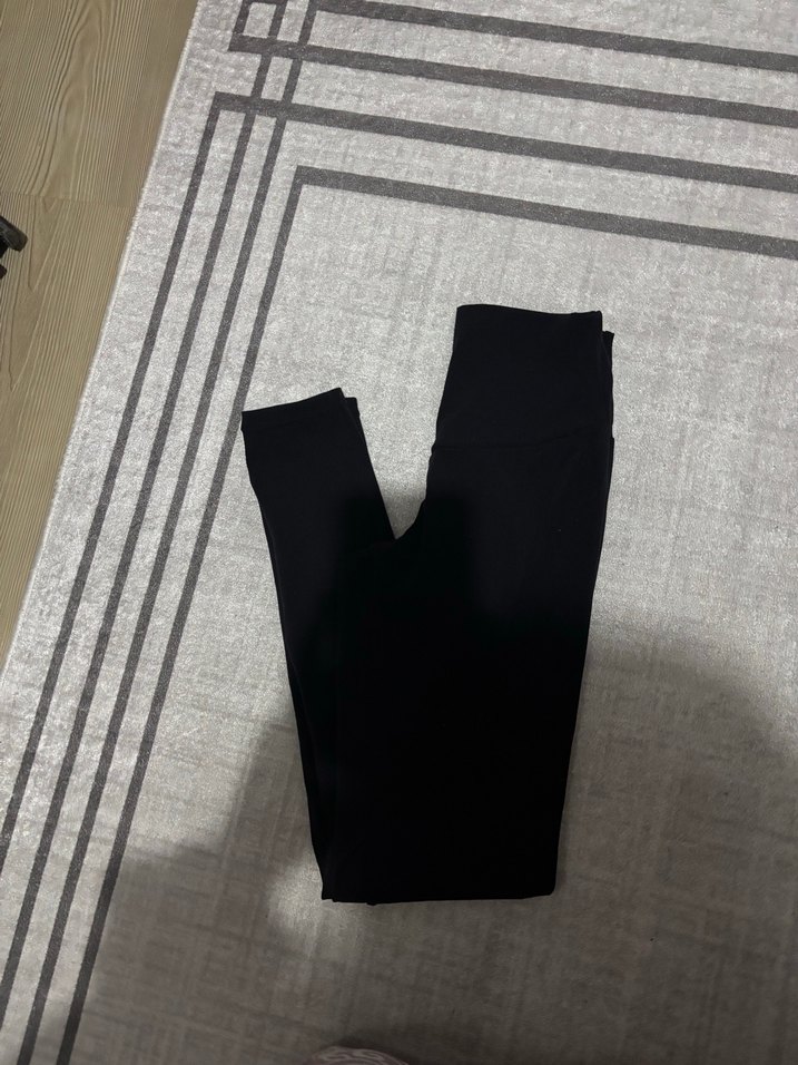 OYSHO markalı, baskılı siyah kadın tayt, esnek beli ve rahat sentetik kumaşıyla günlük sokak tarzına uygun.