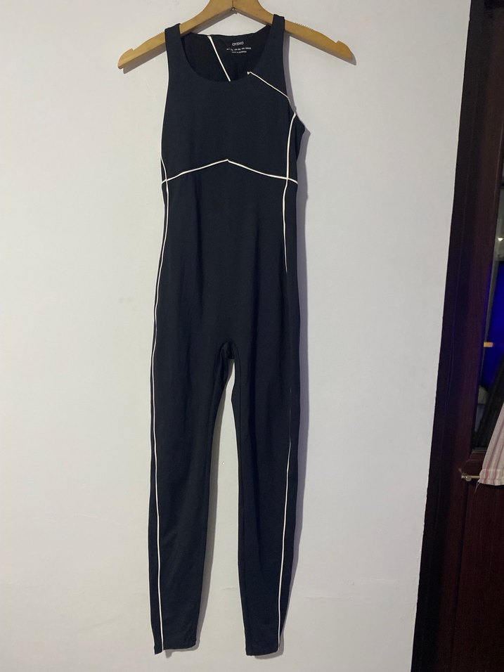 Siyah, ince askılı, yüksek yakalı ve beyaz ince şerit detaylı, sentetik kumaştan yapılmış, sportif ve şık görünümlü dar kesim tulum. Sıfırdır