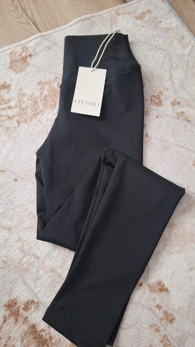 OYSHO marka siyah uzun tayt, elastik bel ve sentetik kumaş ile günlük kullanım için uygundur. Rahat ve sokak stiline uygun.