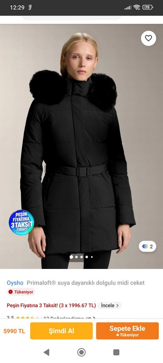 Oysho siyah kemerli midi ceket, suya dayanıklı dolgulu ve uzun kolludur. Notlu yakası ve sade tasarımıyla sokak stiline uygundur.