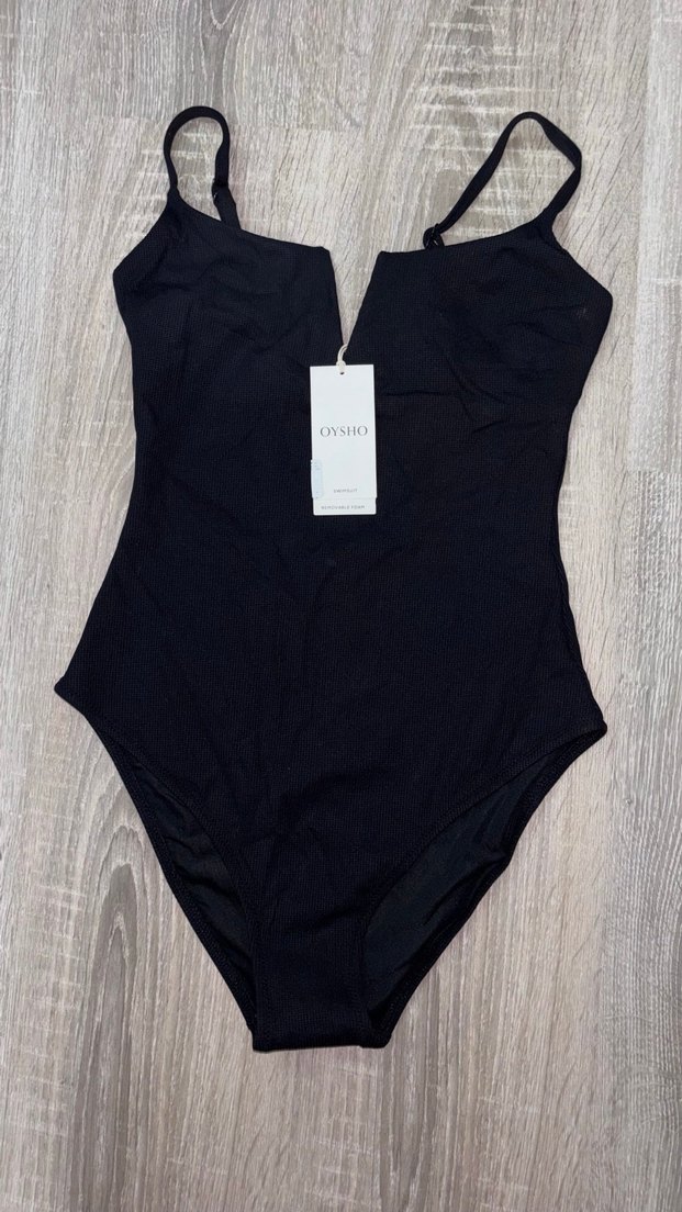 Oysho imzalı, ince askılı, siyah ve sade tasarımlı bu mayo, minimal goth tarzıyla plajda şıklık sunar. ️