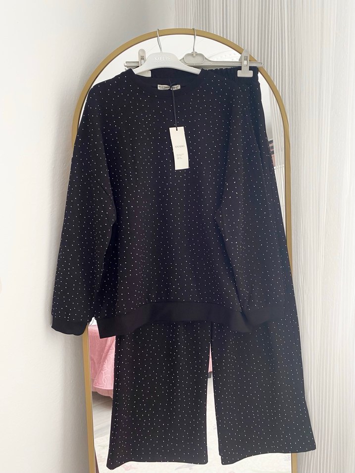 OYSHO Siyah Taşlı Takım. Sıfırdır. Etiketlidir. Muadildir! S bedendir. Rahat, kaliteli bir kumaşı var. Kalıbı geniştir. Takım fiyatıdır. Taşları dökülme yapmaz. Ciddi alıcılar makul teklifler versin! İade kabul edilmemektedir!!!