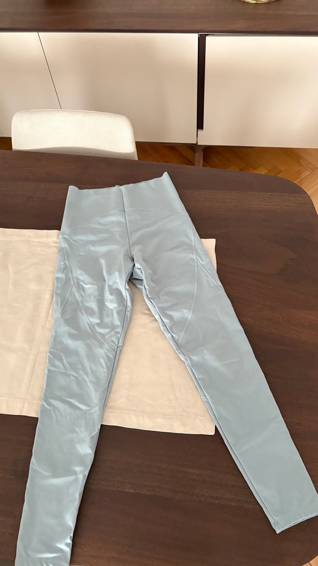 Düz grimsi mavi ara bir renkte kadın spor tayt. Spor ve günlük şıklık için ideal.