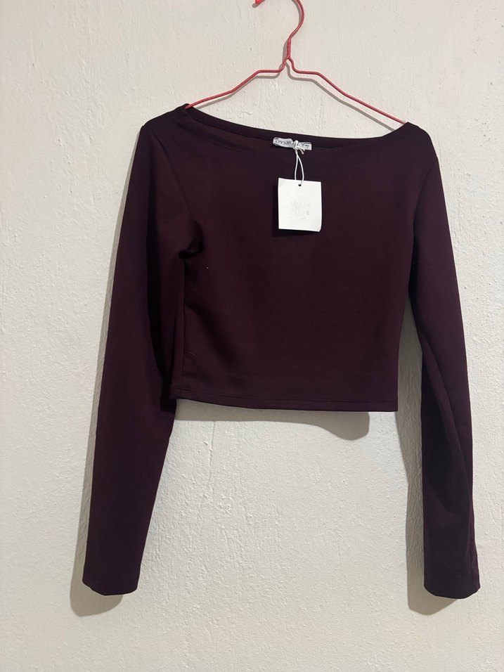 Bordo renk, uzun kollu ve bisiklet yaka crop top. Düz ve minimal tasarım, sentetik yumuşak kumaştan, günlük kullanıma uygun.