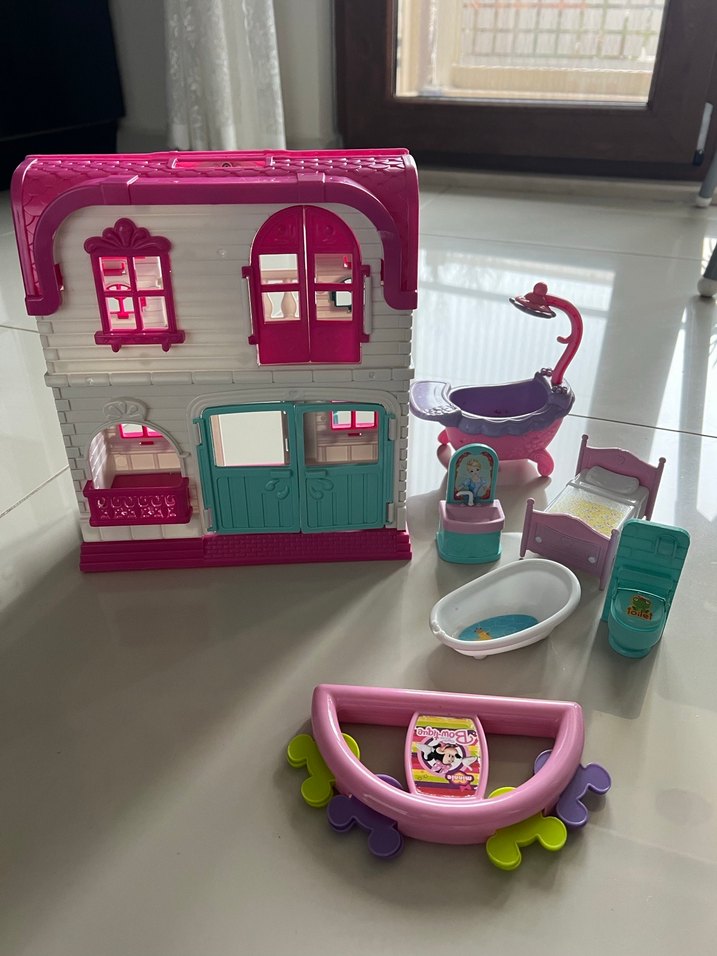 Pastel pembe ve beyaz plastik oyuncak ev seti, iki katlı ev, küvet, yatak ve diğer küçük mobilya parçalarını içerir. Hayal gücünü destekler.