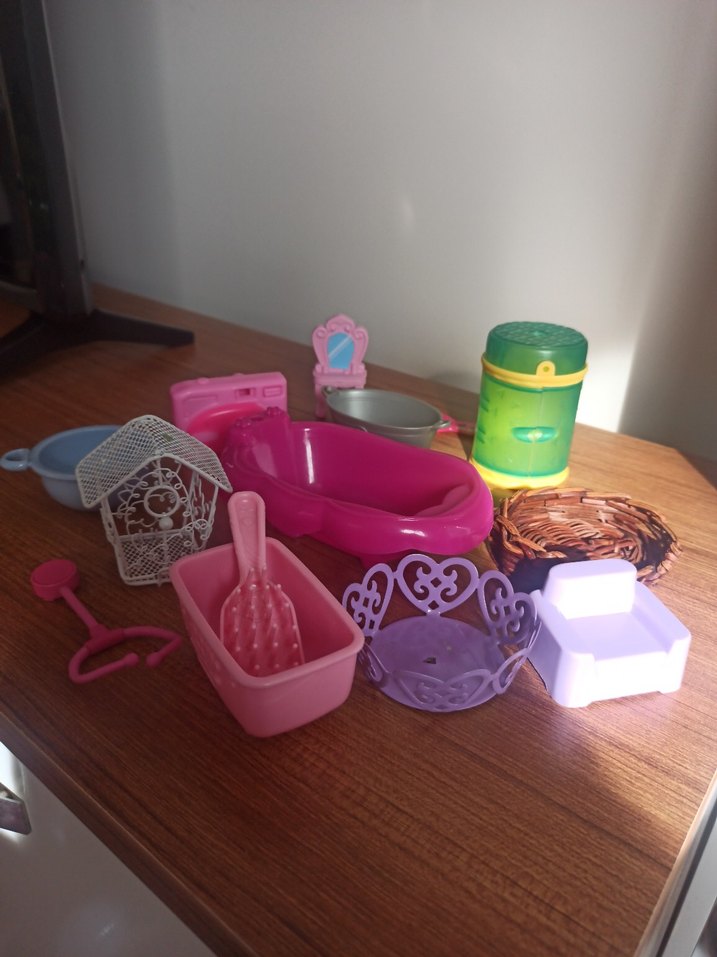 Pastel pembeden oluşan oyuncak ev eşyaları seti, küvet, sandalye, sepet ve diğer aksesuarları içerir. oyun figür evcilik küçük minik
