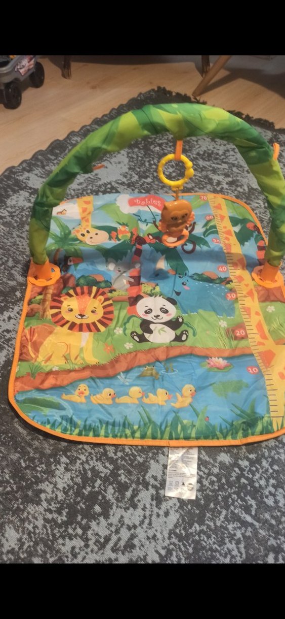 Hayvan desenli, asılan oyuncaklı renkli sentetik kumaş bebek oyun matı. Bebekler için uygundur. cingiraklari da vardir