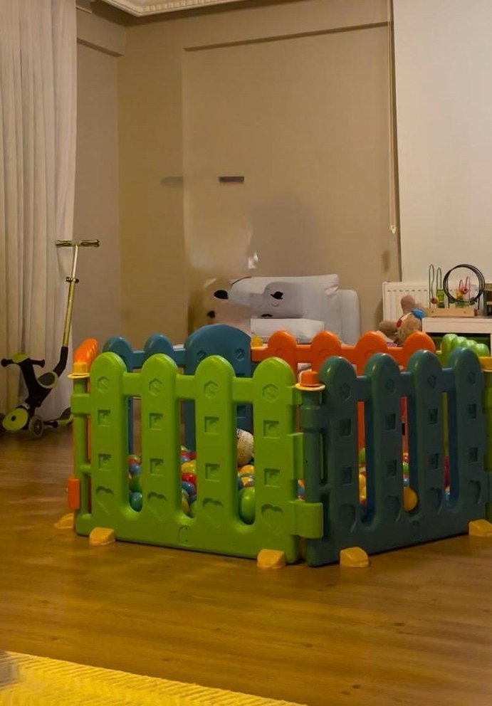 Yeşil panelli renkli oyun parkı, çocukların güvenle oyun oynaması için tasarlanmıştır. Dayanıklı ve canlı renkleriyle iç mekanda güvenli bir alan oluşturur.