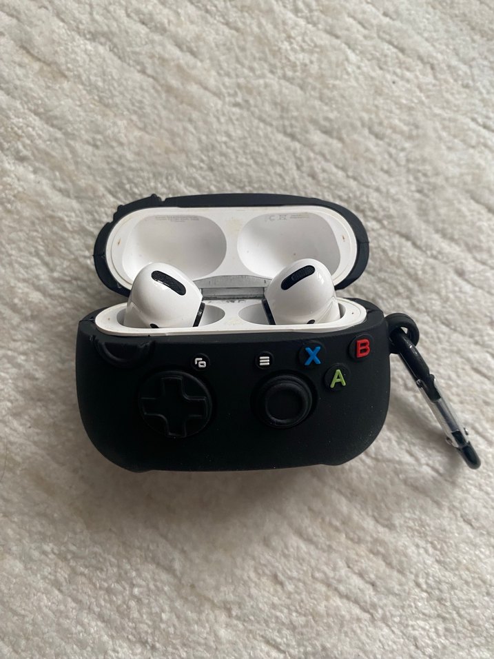 Renkli düğmeli koyu oyun temalı koruyucu kılıf içinde beyaz kablosuz kulaklık kılıfı. ÜRÜN ORİJİNAL AİRPODS PRO UYUMLUDUR.