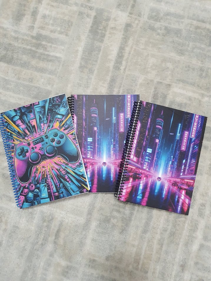 Fütüristik şehir manzaraları ve oyun kumandası desenli renkli kapaklı, spiralli ve kareli tanesi 150 tldir yani fiyat tekli fiyattir