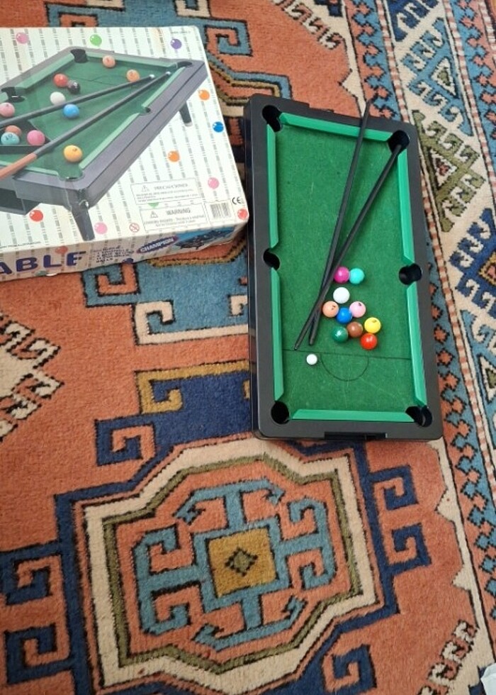 oyuncak bilardo son 2 resimde yuvarlak halka içinde belirtiğim eksik parçaları 1- topları koymak için üçgen üçgeni 2- Bir de masa ayakları ayaklarının olmayışı oynamada herhangi bir mani vermez masa üstünde oynanabilir